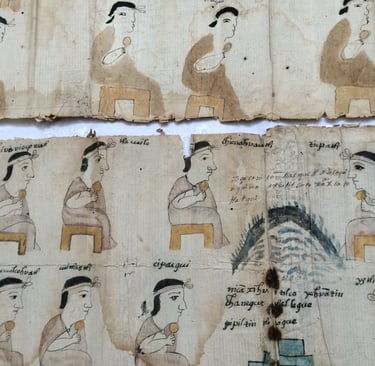 Encontramos 16 documentos que medimos y fotografiamos, entre los cuales dos tiras largas estilo códice, dos mapas, inventario de imágenes, comprobantes de pago de tributos, tabulador de aranceles y títulos de propiedad con fechas de 1711 en adelante. Para este ensayo me centraré exclusivamente en una de las tiras a la que me referirá como Códice Tlaquimpa uno.
